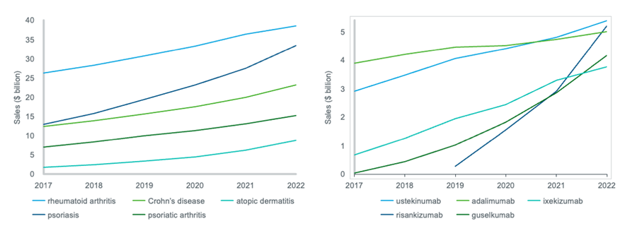 Source: IQVIA MIDAS Disease. Sales are global and ex-manufacturer, calculated using a constant exchange rate. In the first line chart, the value of each indication is the total value of all its respective products. In the second line chart, the value of each molecule is its value within the psoriasis market only.