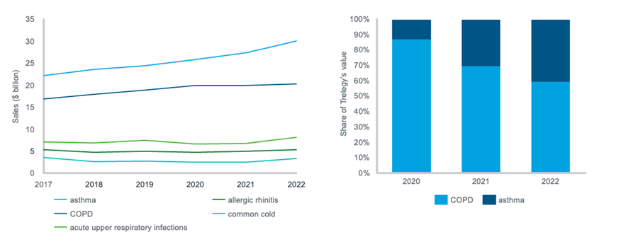 Within the respiratory therapy area, asthma and COPD have together consistently constituted over 50% of the market for the last five years, and triple-therapy inhalers such as Trelegy (fluticasone furoate, umeclidinium and vilanterol) are driving growth in both of these indications. Trelegy was approved by the FDA for COPD in mid-2017, and for asthma in mid-2020. As illustrated in Figure 2, asthma is responsible for an increasing percentage of Trelegy’s sales, exceeding 40% in 2022.