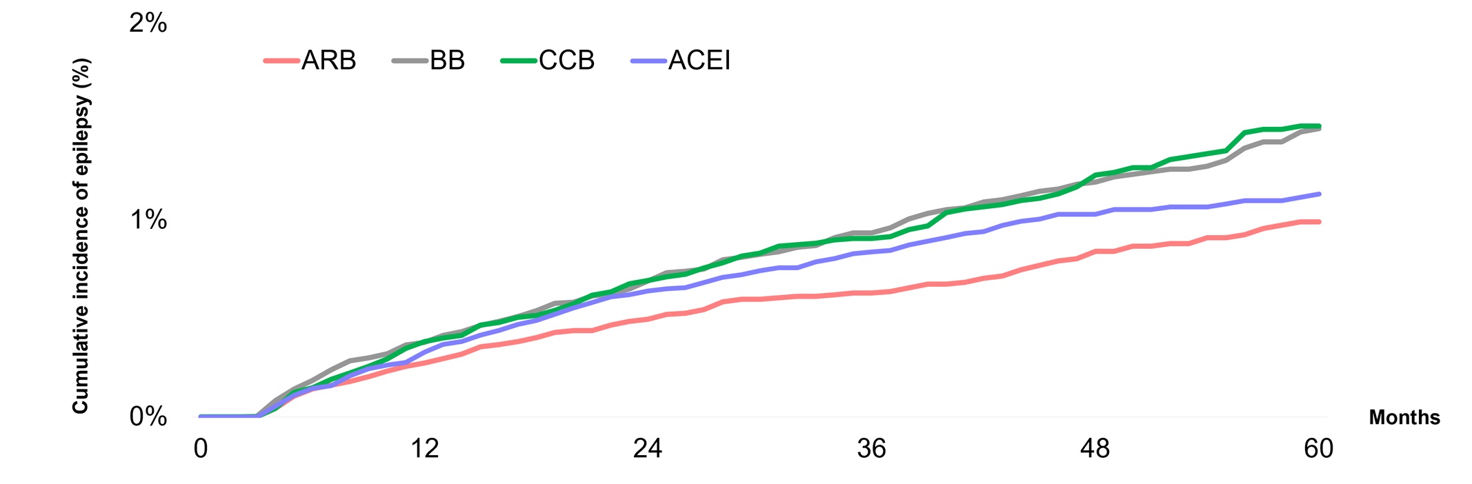 Zu den Ergebnissen: Die Inzidenz von Epilepsie innerhalb von fünf Jahren war am niedrigsten bei Patienten, die mit Angiotensin-II-Rezeptorblockern (ARB) behandelt wurden (0,27% nach einem Jahr, 0,63% nach drei Jahren, 0,99% nach fünf Jahren), und am höchsten in den Gruppen mit Betablockern (BB) oder Kalziumkanalblockern (CCB; je 0,38% nach einem Jahr, 0,91%/0,93% nach drei Jahren, 1,47%/1,48% nach fünf Jahren). ACE-Hemmer (ACEI) lagen zwischen Angiotensin-II-Rezeptorblockern und Kalziumkanalblockern.