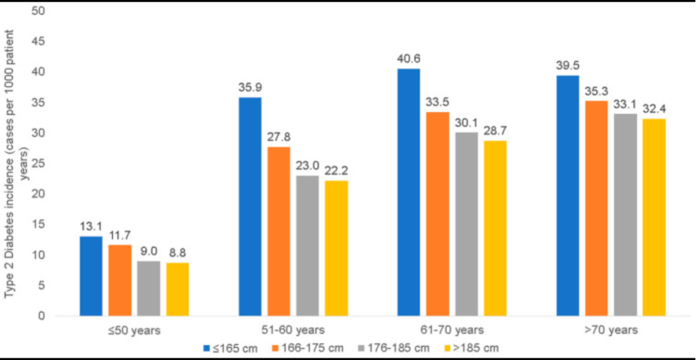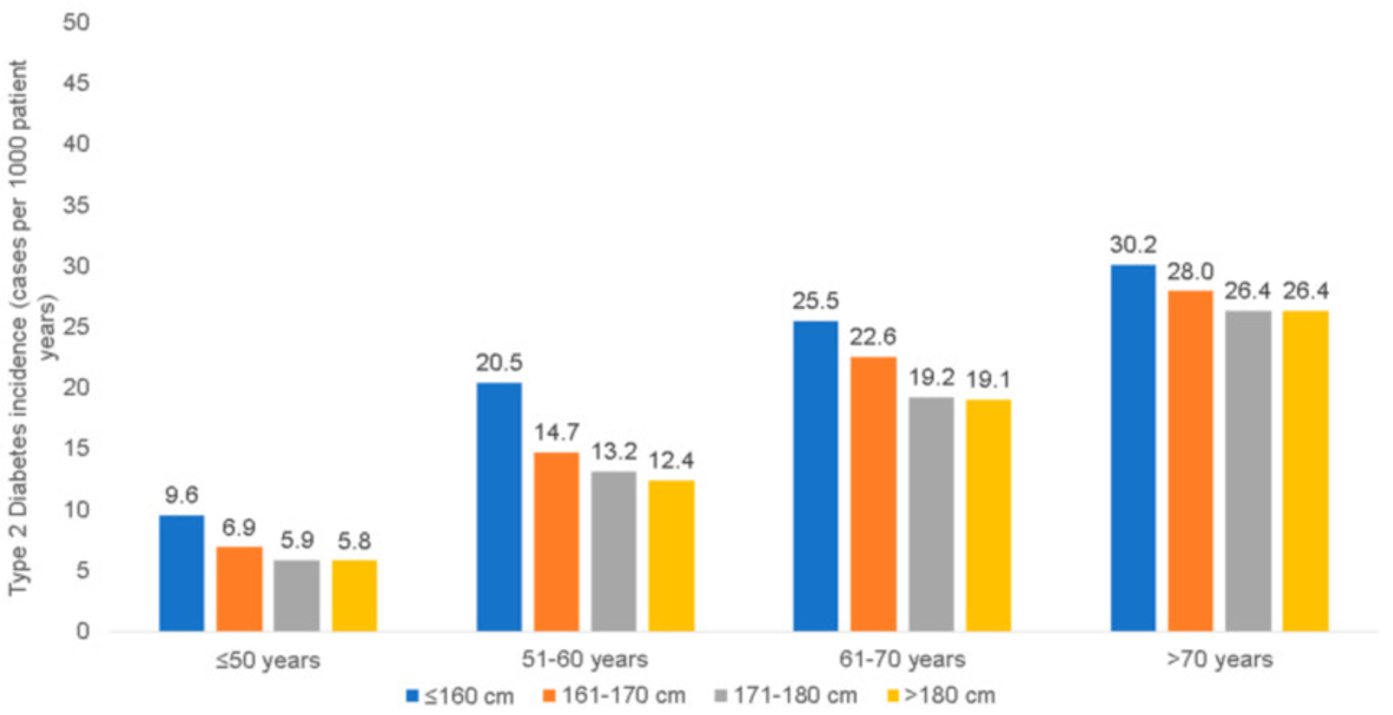 Sowohl bei Frauen als auch bei Männern in allen Altersgruppen nimmt die Inzidenz von Typ-2-Diabetes mit zunehmender Körpergröße ab. Dies wurde mittels multivariablen Cox-Regressionsanalysen (statistisches Vorhersagemodell) festgestellt, die für das Alter und den Body-Mass-Index adjustiert wurden. Das Risiko für einen neu auftretenden Typ-2-Diabetes steigt demnach bei Frauen um 15% und bei Männern um 10% für jede Abnahme der Körpergröße um 10 cm. Signifikante Zusammenhänge zwischen der Körpergröße und der Entwicklung von Typ-1-Diabetes gab es nicht.