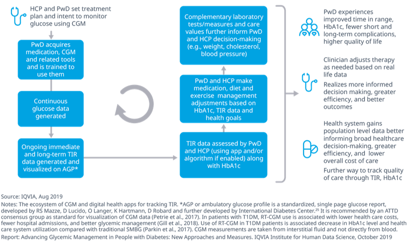 Finally, to advance into a new era of care in diabetes — where all diabetes management tools including HbA1c and, increasingly, TIR, are optimized and personalized — the report examines various approaches to further the use of TIR that can help address the need for improved blood glucose management. There are three critical stages in this process: establishing the importance of TIR for blood glucose management across key stakeholders, advancing the use of this metric and promoting ease of use of technologies, and, lastly, perpetuating the use of TIR to sustain blood glucose management across all appropriate diabetes populations. Within this framework, approaches that can further the use of TIR are suggested from a PwD, healthcare policy, and healthcare delivery perspective, and consider issues such as advocacy, access and interoperability.