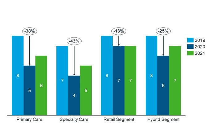 The commercial teams within the Hybrid segment were impacted the least during the lockdown period when compared to all other segments. The Hybrid representative model bridges multiple healthcare disciplines and, therefore, could adapt to achieve access within the healthcare industry. The Hybrid segment also demonstrated the best recovery post-lockdown. The impact that the pandemic and lockdown regulations expressed on access of HCPs within the Hybrid segment was overall marginal.