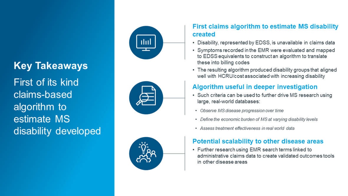 This study, which was recently published in the Journal of Medical Economics, is the first of its kind to show how a claims-based algorithm can be used to estimate MS disability utilizing data from EMRs. It proves that complex disease data can be drawn from these RWD resources, advancing the opportunity to examine outcomes in the absence of standard markers of disease progression.