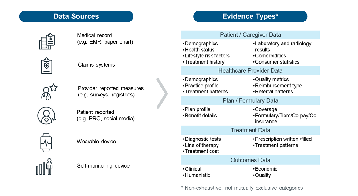 Figure 1: The RWD value chain addresses evidence needs through a multi-sourced platform of healthcare data sources.