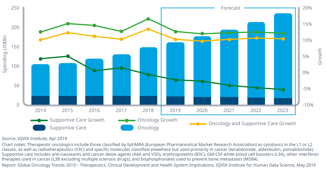 Oncology spending will reach nearly $240 billion through 2023, growing 9–12%