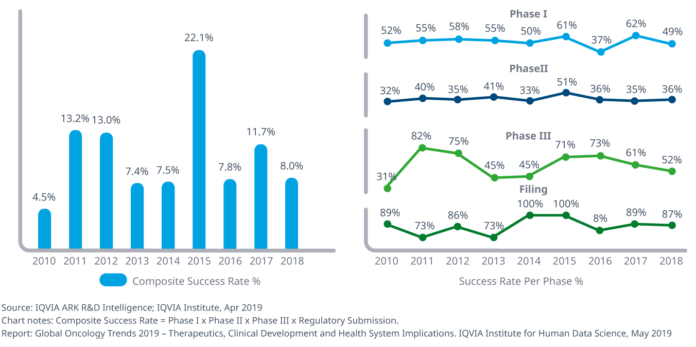 Oncology clinical trials have a high risk of failure with a composite success rate of 8% in 2018, slightly lower than the average since 2010