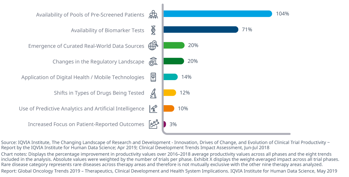 Modelling the impact of current clinical development trends on future productivity, the availability of pools of pre-screened patients and biomarker tests could yield productivity improvements of as much as 104% and 71%, respectively, by 2023.