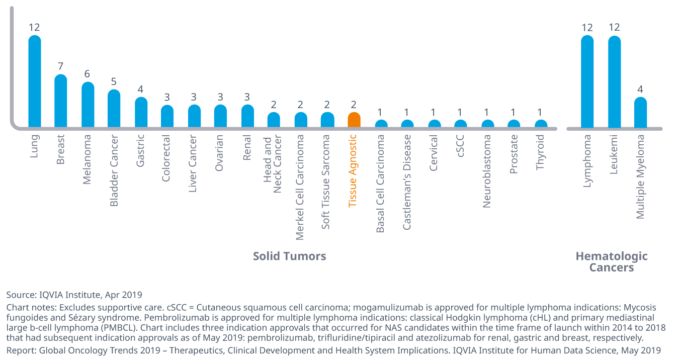- Almost one-third of the approved indications over the past five years have been for hematologic cancers while lung cancer leads the solid tumors with 12 indications, followed by breast cancer and melanoma.