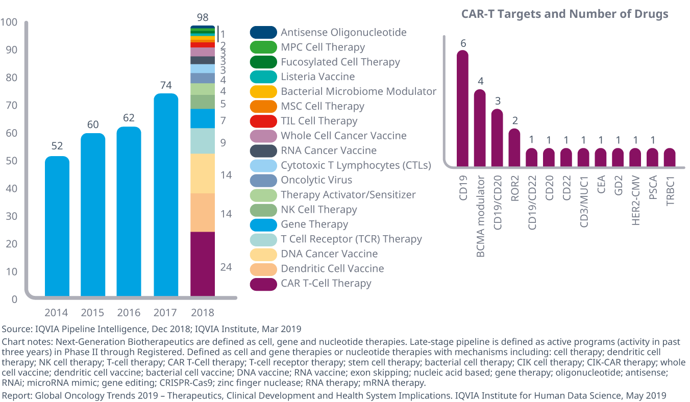 - The number of Next-Generation Biotherapeutics − defined as cell, gene and nucleotide therapies − in development for oncology has more than doubled since 2013 and has grown 32% from 2017 to 2018, as new pathways for disease treatment and cure command growing attention and investment.