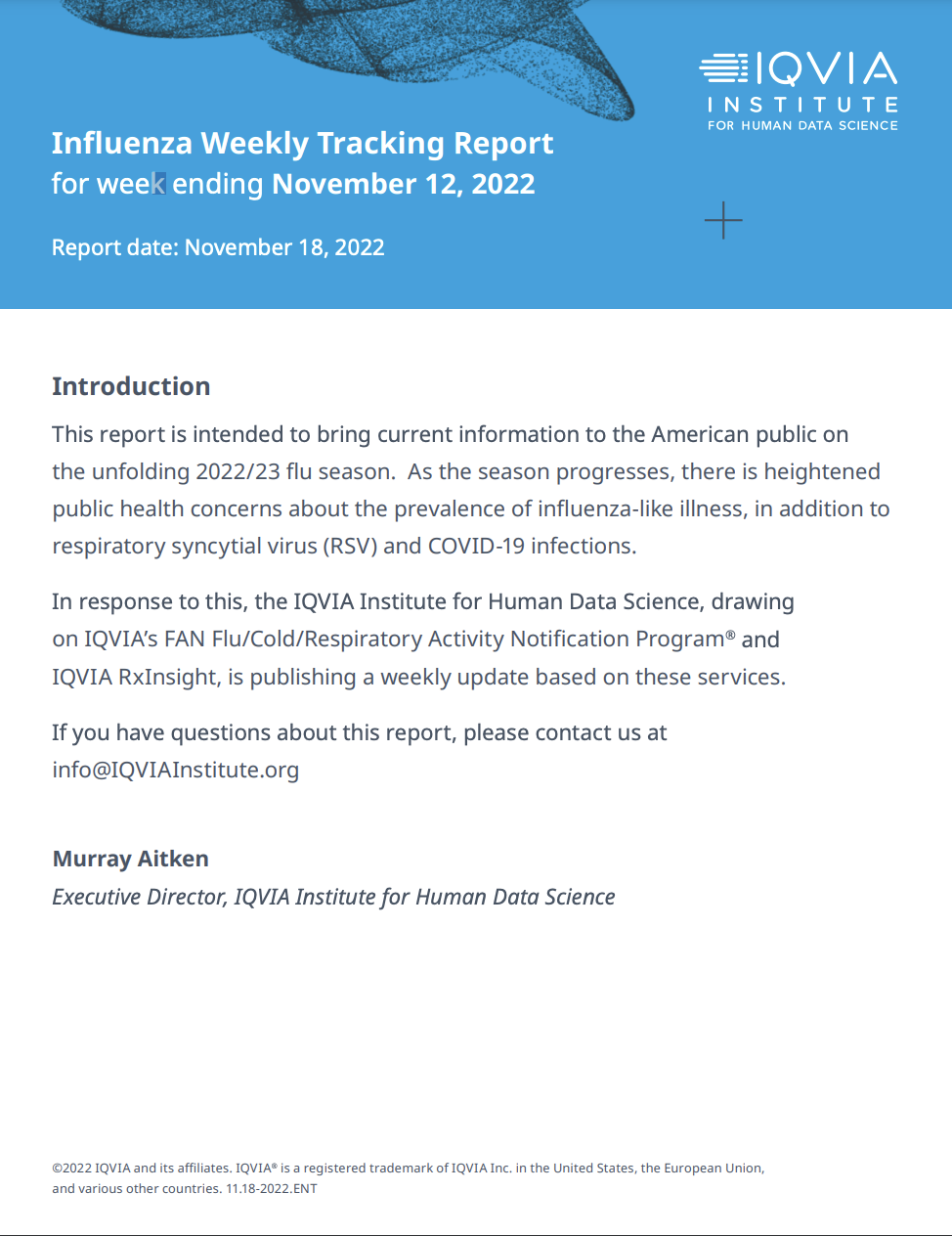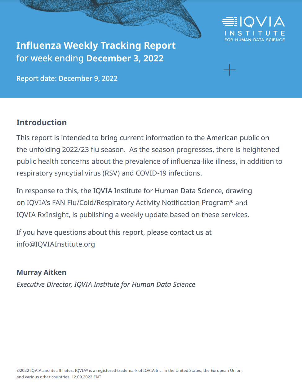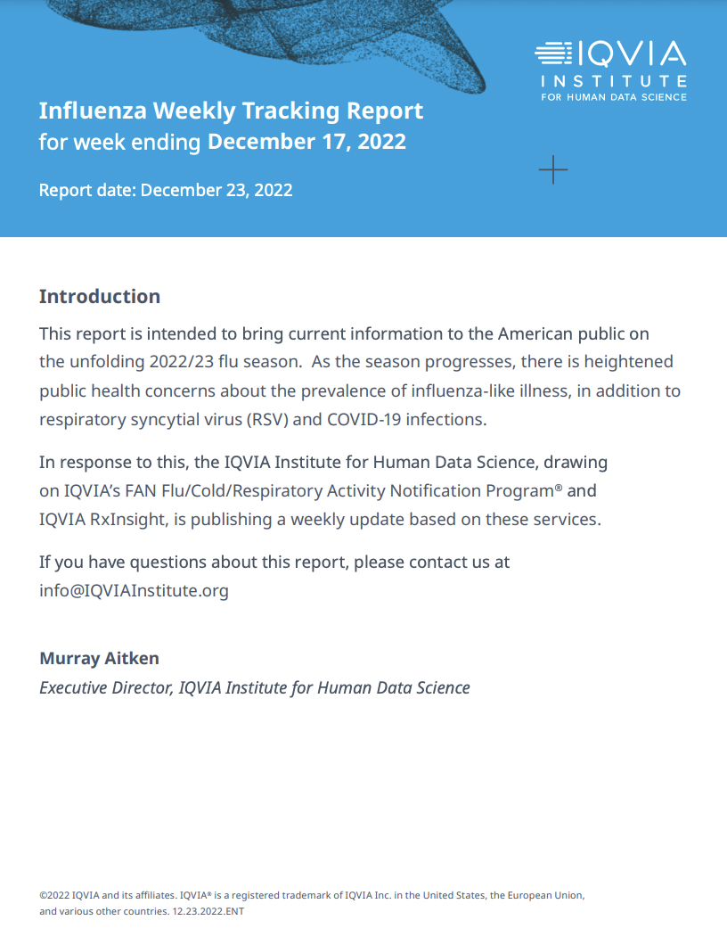 In an effort to bring information to the American public on the 2022/23 flu season, the IQVIA Institute for Human Data Science published a series of weekly updates that draw on IQVIA’s FAN Flu/Cold/Respiratory Activity Notification Program® and IQVIA RxInsight.